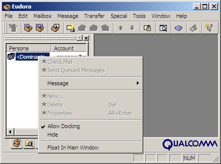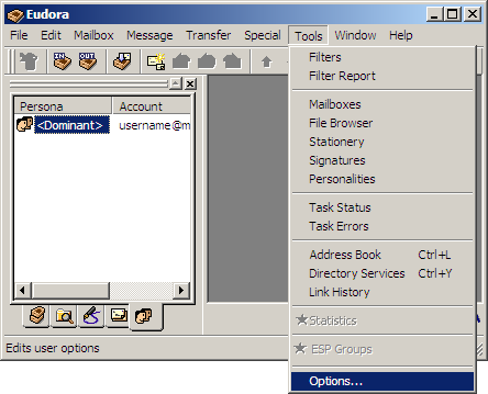 If you selected Lite Mode when you installed Eudora, you will not be able to access the dominant e-mail account's properties by right clicking in the Personalities window; the properties option is grayed out.  Eudora only allows one e-mail account in Light Mode and you can only access the properties through Options.