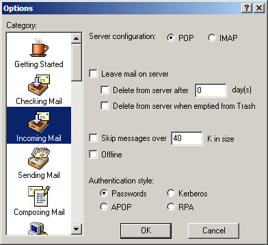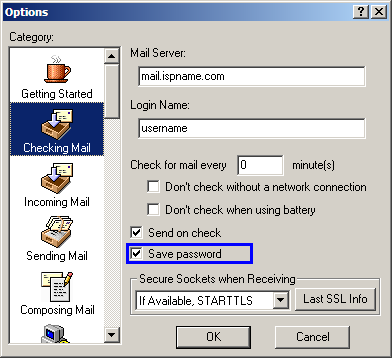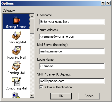 Mail Server (Incoming)  =  The Incoming (POP3) mail server usually follows this format:  mail.ispname.com (or .net).  Replace the "ispname.com (or .net)" with your ISP's name. Login Name  =  Enter your e-mail username (everything before the @). SMTP Server (Outgoing)  =  The Outgoing (SMTP) mail server usually follows this format: mail.ispname.com (or .net).  Replace the "ispname.com (or .net)" with your ISP's name.