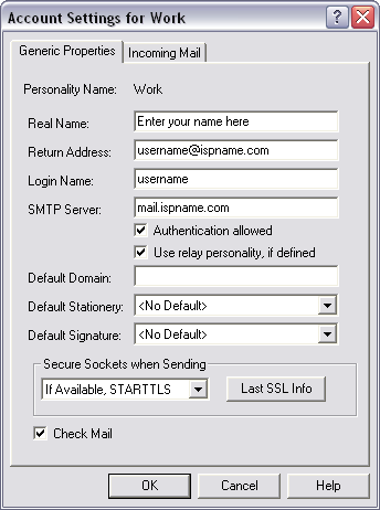 SMTP Server  =  The Outgoing (SMTP) mail server usually follows this format: mail.ispname.com (or .net).  Replace the "ispname.com (or .net)" with your ISP's name.