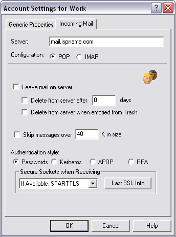 Server  =  The Incoming (POP3) mail server usually follows this format:  mail.ispname.com (or .net).  Replace the "ispname.com (or .net)" with your ISP's name.