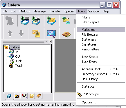 If the Mailboxes pane is not already open, you can click its tab or on the Toolbar, click Tools and select Mailboxes from the menu.