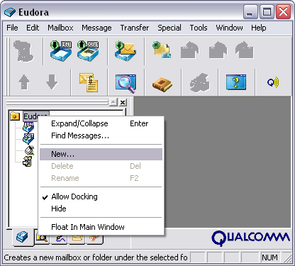 Then right-click the Eudora folder and select New from the menu as shown below.