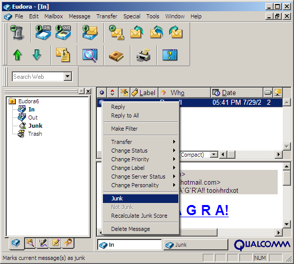 In the screenshot below, a junk message arrived in my inbox. All I need to do is right click the message and select Junk from the menu. Eudora will send the message to the Junk mailbox. Eudora will also learn from this, so the next time an e-mail comes matching the criteria of this e-mail, Eudora will label it as junk and send it to the Junk mailbox.