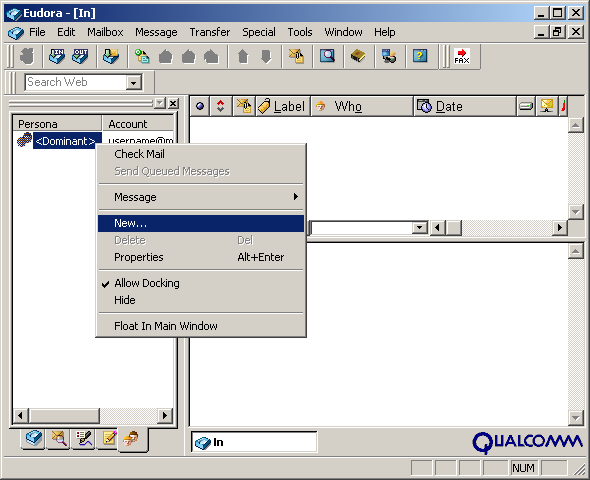 Below is a tutorial on setting up e-mail accounts. In Eudora, e-mail accounts are referred to as personalities. If you're a user with more than one e-mail account, Eudora can manage them for you. Just follow the screenshots below.