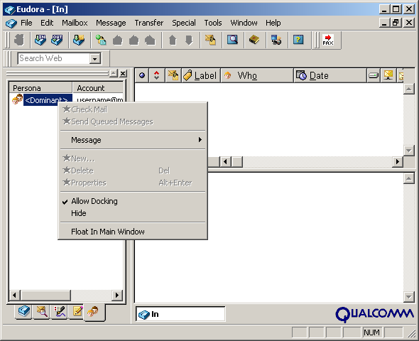 If you selected Lite Mode when you installed Eudora, you will not be able to access the dominant e-mail account's properties by right clicking in the Personalities window; the properties option is grayed out. Eudora only allows one e-mail account in Light Mode and you can only access the properties through Options. The following tutorial explains how to edit this mode.