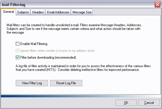 On the General tab you should enable Filter before downloading (recommended). This way you only download on your computer the e-mail you want, not all the e-mail (including spam) sent to you.