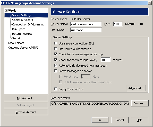 User Name = Enter your e-mail username (everything before the @). Port = This should be the default setting: 110.