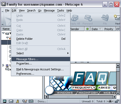 Filters are rules telling Netscape how to manage your e-mail. They are used in conjunction with folders. They can be used to send e-mail automatically to folders you create or eliminate e-mails you don't want. In this tutorial, we'll create a filter that sends a specific e-mail to the folder we created in the 'Folders' tutorial.