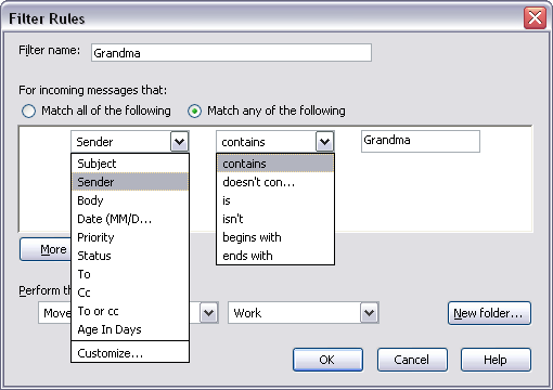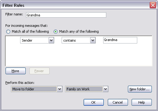 Now, any e-mail message that has the Sender field containing Grandma will be moved automatically to the Family folder.