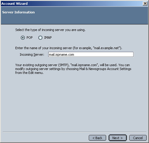 Incoming Server = The Incoming (POP3) mail server usually follows this format: mail.ispname.com (or .net). Replace the "ispname.com (or .net)" with your ISP's name.