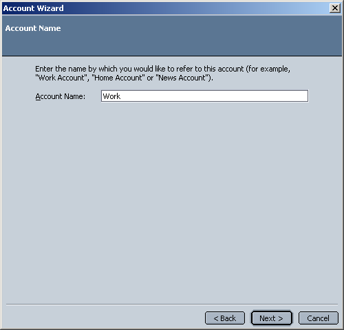 Account Name = Enter a name for the e-mail account. It doesn't matter what you call it, but it should be distinctive. This will help you distinguish it from any other e-mail accounts you create.