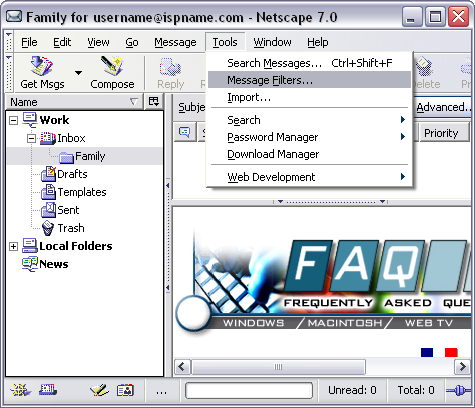 Filters are rules telling Netscape how to manage your e-mail.  They are used in conjunction with folders.  They can be used to send e-mail automatically to folders you create or eliminate e-mails you don't want.  In this tutorial, we'll create a filter that sends a specific e-mail to the folder we created in the 'Folders' tutorial.
