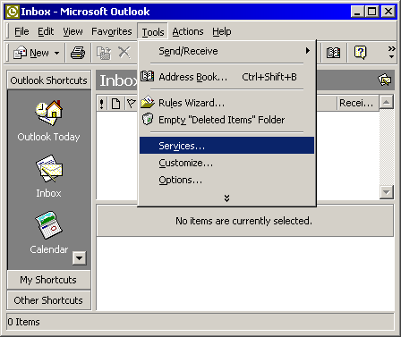 Sometimes Outlook contains what is known as Services in the Tools menu instead of Accounts. Outlook 2000 has both the Services version as well as the Accounts version; it depends on how Outlook 2000 was originally configured.