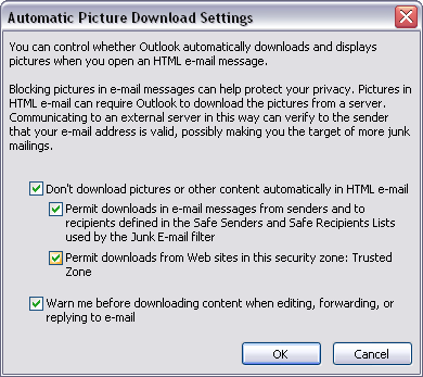 Downloading pictures can be a high security risk. Pictures in HTML e-mail can require Outlook to download the pictures from a server. When you download them from a server, the server will automatically know your e-mail address is a valid one. This could result in much more spam.