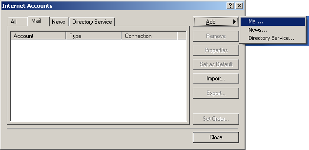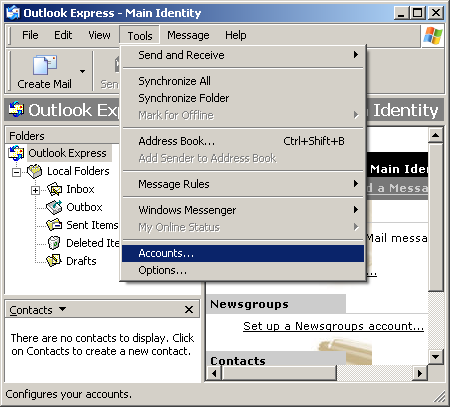 Note: if you're opening Outlook Express for the first time, you will not see the window below. You will see the Internet Connection Wizard. Click here to jump to that step.