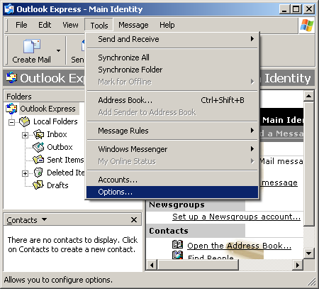 Outlook Express' Options menu provides many features that apply to all of your Accounts.  These options include signatures, fonts, stationary, etc.  We will focus below on three features of the Options menu which are the most commonly used and often cause problems: