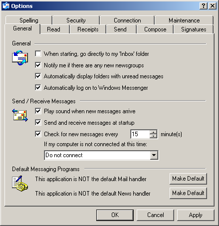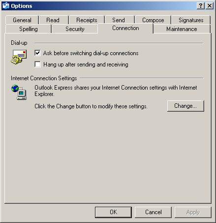 If Outlook Express is disconnecting as soon as you finish sending/receiving your e-mail and/or newsgroups, the following two screenshots may help you fix this problem.