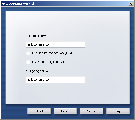 Incoming server = The Incoming (POP3) mail server usually follows this format:  mail.ispname.com (or .net).  Replace the "ispname.com (or .net)" with your ISP's name.