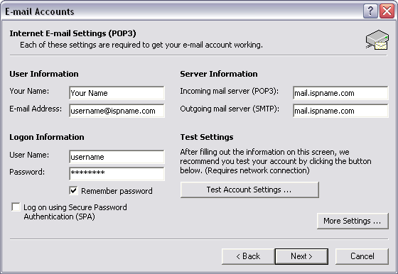 Incoming mail server (POP3)  =  The Incoming (POP3) mail server usually follows this format:  mail.ispname.com (or .net).  Replace the "ispname.com (or .net)" with your ISP's name.