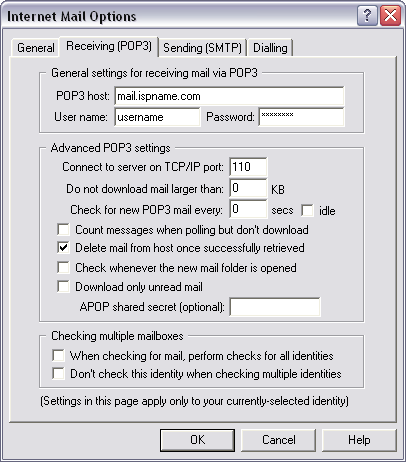 General settings for receiving mail via POP3: