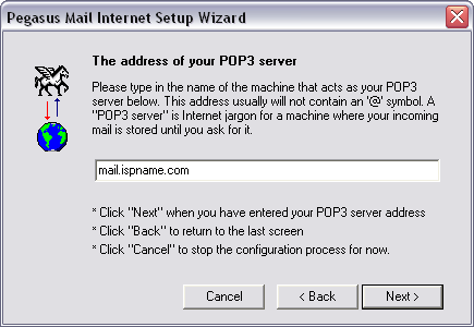 The address of your POP3 server  =  The Incoming (POP3) mail server usually follows this format:  mail.ispname.com (or .net).  Replace the "ispname.com (or .net)" with your ISP's name.