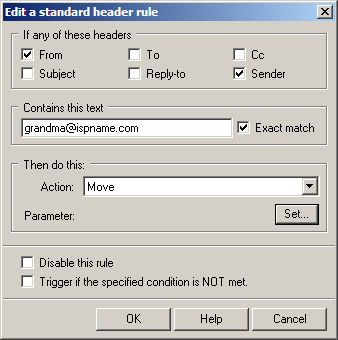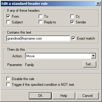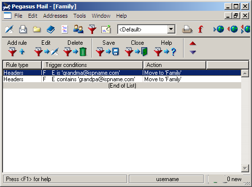The new rule now appears in the list of rules along with any others you may have added. Any e-mail that "grandma@ispname.com" sends will be forwarded automatically to the "Family" folder.