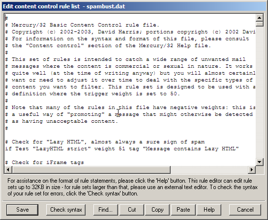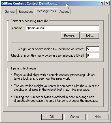 Filename: spambust.dat = This list is Pegasus' extensive anti-spam list. It contains rules that test e-mail and define whether the e-mail is spam or not. Each e-mail receives a rating. The rating of 50 or more activates the filter, and the e-mail is sent to the Junk or suspicious mail folder.
