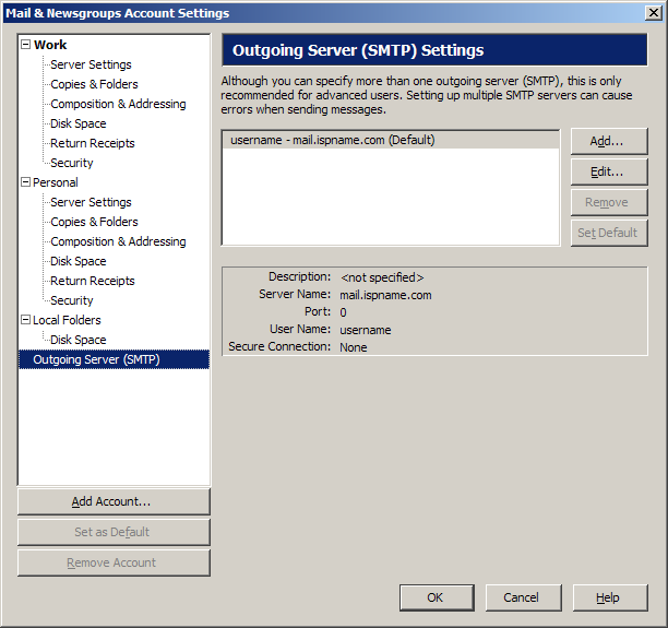 The Outgoing (SMTP) mail server usually follows this format: mail.ispname.com