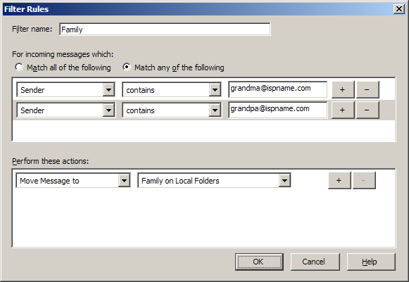 Now whenever I receive an e-mail from 'grandma' or 'grandpa', SeaMonkey will automatically send it to my Family folder.